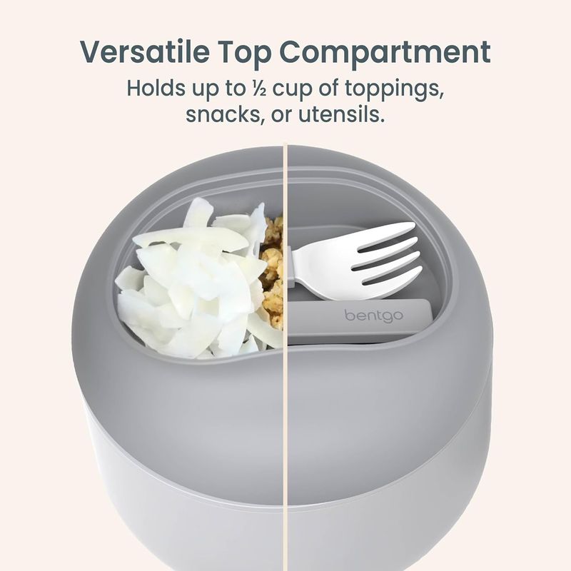 - Compartimento para snacks: Espacio integrado en la parte superior con capacidad de media taza, diseñado para mantener secos y frescos los snacks como granola, galletas o frutos secos.