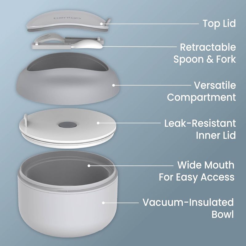 - Diseño Ergonómico: Presenta una tapa de fácil apertura y una base con muescas (notched base) que facilita el agarre y manejo mientras se come en movimiento. Ideal para sopas, cereales, arroz o smoothie bowls.