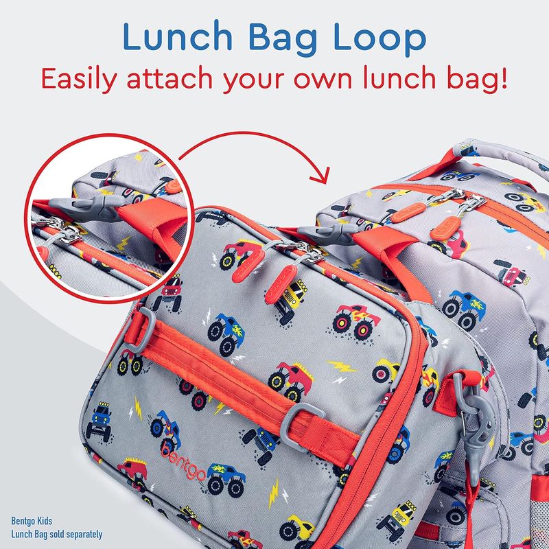 • Sistema de acople para lonchera: Incluye un sujetador resistente en la parte superior diseñado especialmente para asegurar la lonchera Bentgo Kids Prints, permitiendo que el niño lleve todo su equipo de forma segura y compacta.
