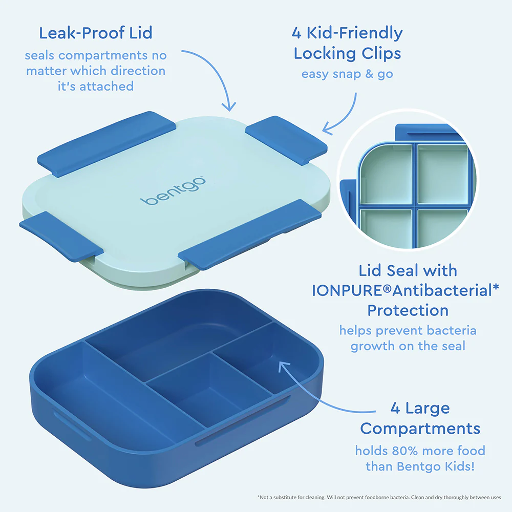 Este contenedor tiene una capacidad total de 993 ml, lo que representa un 80% más de espacio que nuestros modelos Bentgo Kids tradicionales. Con 4 compartimientos, es la solución perfecta para niños con mayor apetito o para empacar un plato principal completo (como un sándwich entero) junto con frutas, vegetales y snacks en los compartimentos laterales.