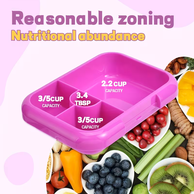 El interior está distribuido estratégicamente con tres compartimentos. Cuenta con un espacio principal amplio para el plato fuerte y secciones más pequeñas para vegetales, frutas o snacks.