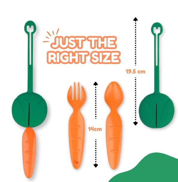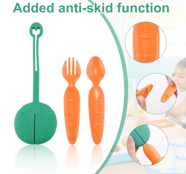 • Acceso rápido: El estuche flexible permite que los niños saquen el tenedor y la cuchara fácilmente a través de la ranura frontal.