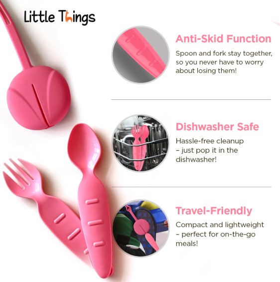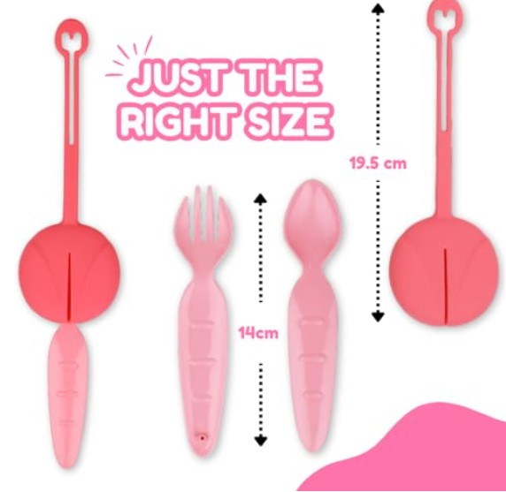 • Acceso rápido: El estuche flexible permite que los niños saquen el tenedor y la cuchara fácilmente a través de la ranura frontal.