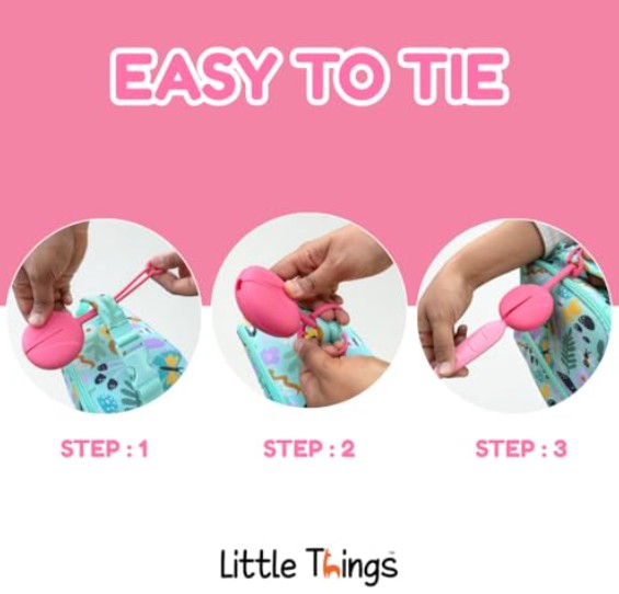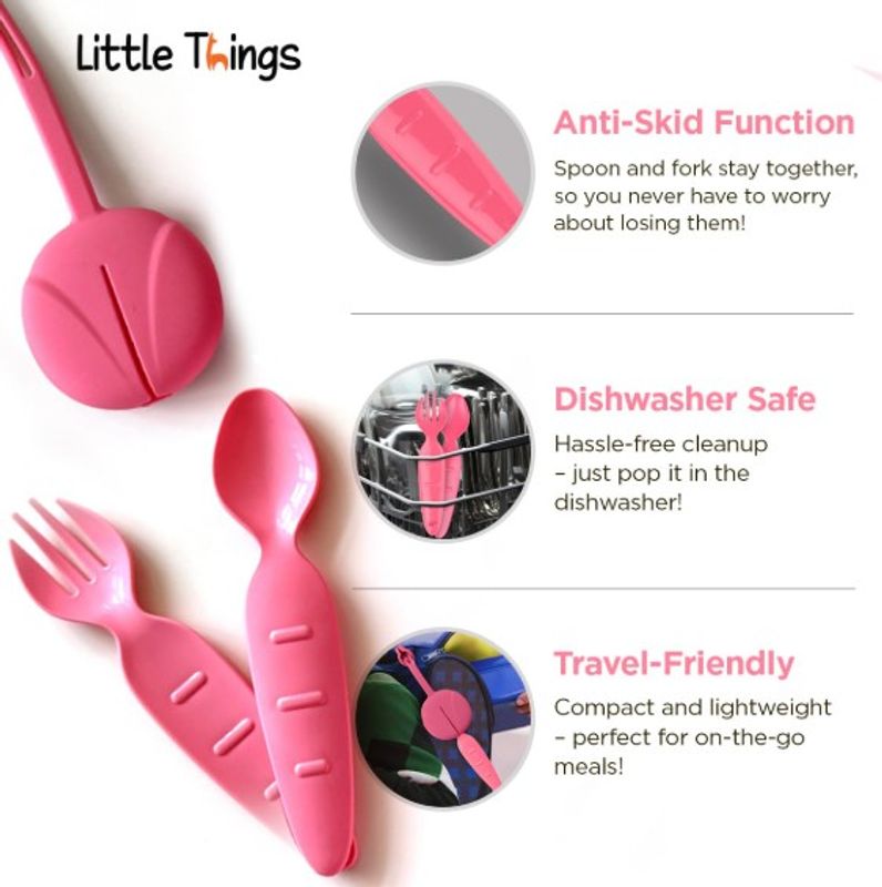 Este set ligero y compacto incluye una funda de silicona flexible con un lazo integrado para sujetarlo fácilmente a loncheras, mochilas o bolsas de pañales. ¡Siempre a mano y nunca perdidos!
